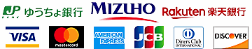 銀行振込(ゆうちょ銀行、みずほ銀行、楽天銀行)及び、クレジットカード決済(VISA・MasterCard・AmericanExpress・JCB・DinersClub・Discover)にも対応しております。